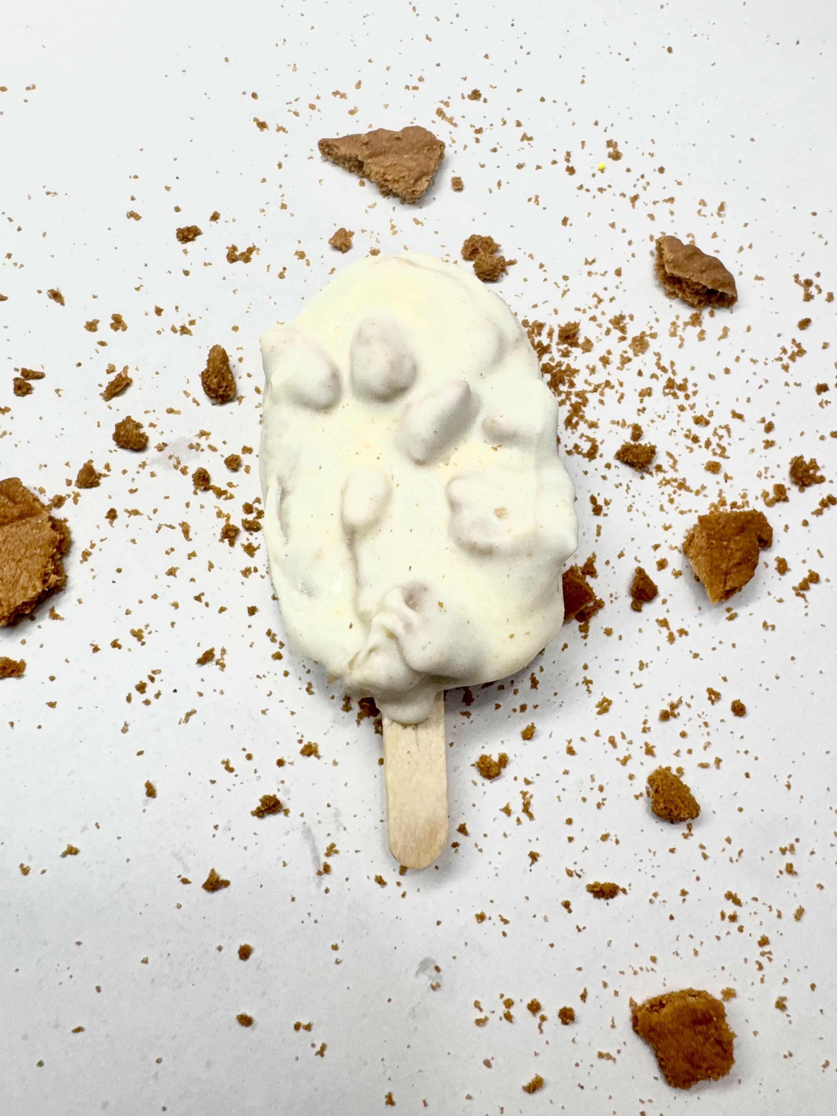 Carmel butter Biscoff®-flavored cake coated in smooth vanilla candy and topped with crunchy Biscoff® cookie pieces.