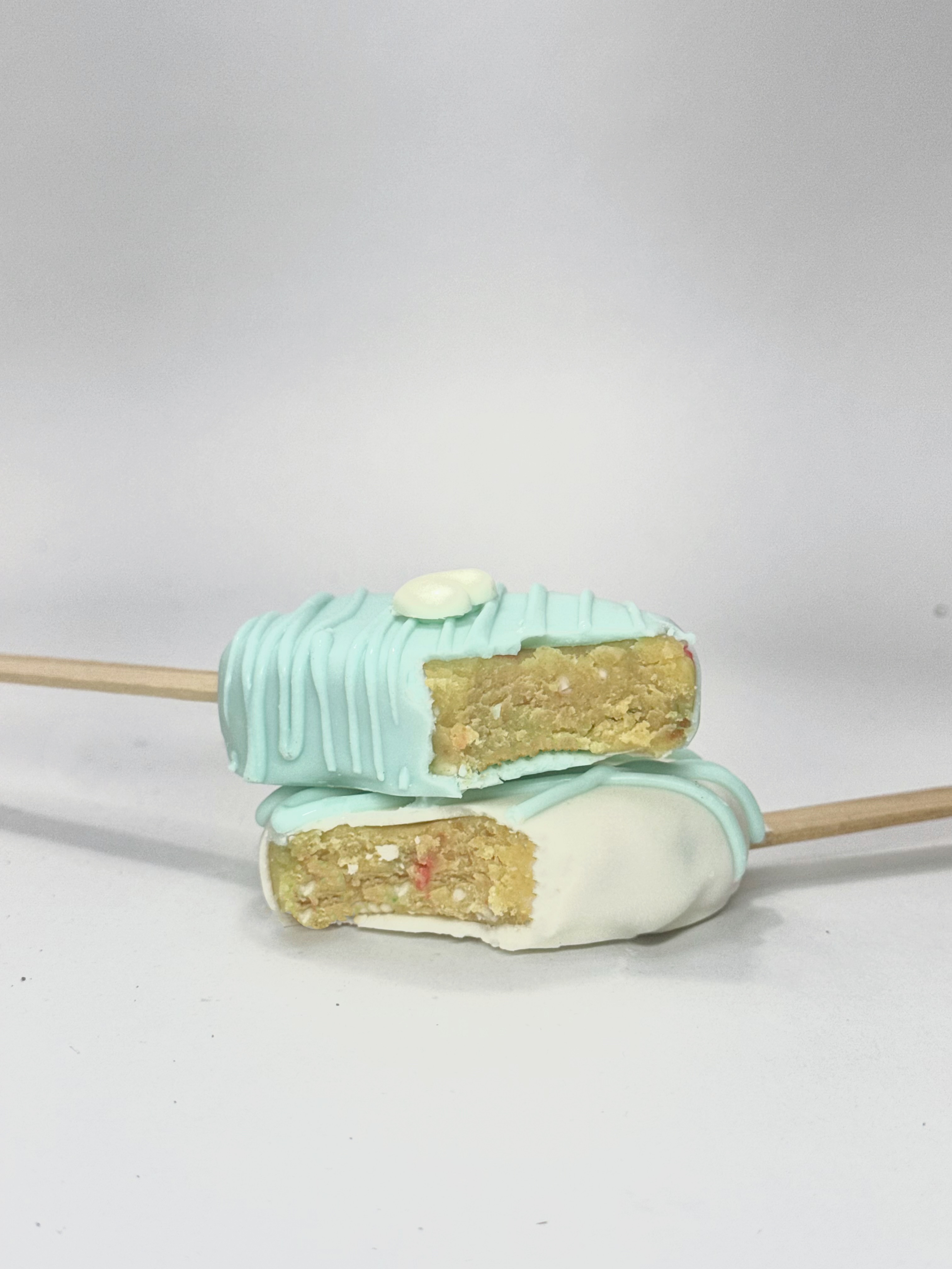 Classic confetti birthday cake dipped in a sweet candy coating and finished with bright rainbow sprinkles.