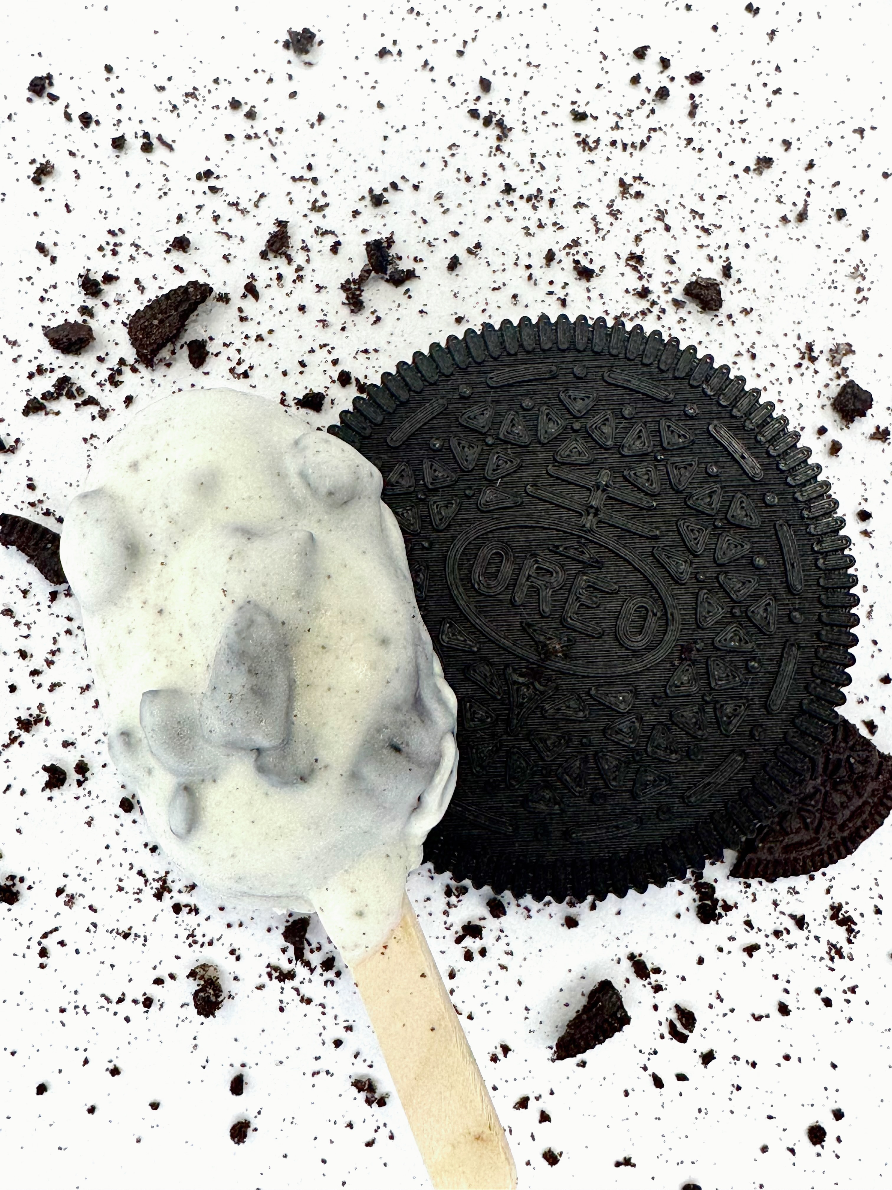 Decadent rich chocolate cake coated in smooth vanilla candy and finished with crunchy cookie pieces.